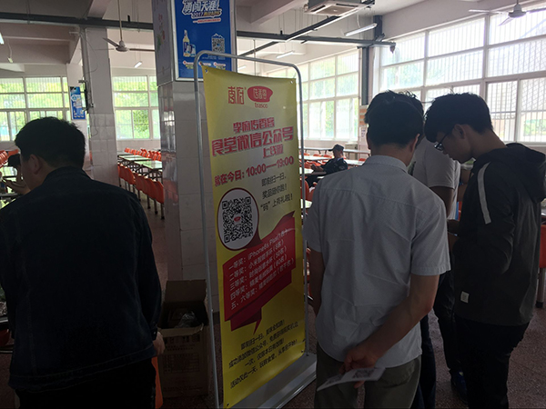 2017年04月18日上午10时许,以“优质服务月”为主题的李府传香客微信公众号推广活动在滁州学院蔚然食堂拉开帷幕。本次活动得到了滁州学院后勤领导的大力支持,集团副总经理张超、总经办副主任梁灿携事业部、网络部、办公室等工作人员前往现场指导工作,保证活动顺利进行并取得实效。据后台数据统计,当天有超过1200名滁州学院师生参与了集团微信公众号“幸运大转盘”活动。