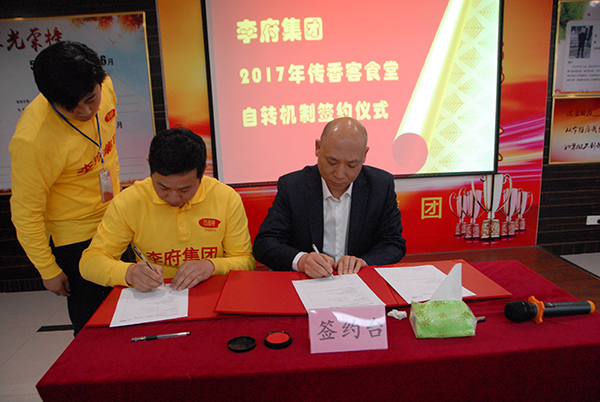 PPT分享结束后,传香客安职院、滁州学院、安理工食堂负责人带领各自团队逐一上台与辛董签订食堂经营机制并接受辛董的聘任书,集团副总经理、落地委领袖张超做为第三方见证此环节。食堂自转承包机制的签订充分体现我集团贯彻落实“我的地盘我做主、我的责任我承担、我的生命我体验”这一原则,将“百年李府梦”与每一位员工结合在一起,真正做到企业富、员工富。