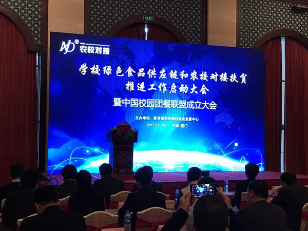 学校绿色食品供应链和农校对接扶贫推进工作启动大会暨中国校园团餐联盟成立大会于2017年12月14日在厦门举行。三百多位来自全国省级教育行政部门负责高等院校后勤管理工作的领导、高等院校后勤管理负责人及受推荐的优质团餐企业负责人以及部分国内大型团餐企业负责人出席了会议。我集团董事长辛董作为安徽团膳餐饮企业代表应邀参加本次大会并在会上与参会人员进行相关经验的交流与研讨。