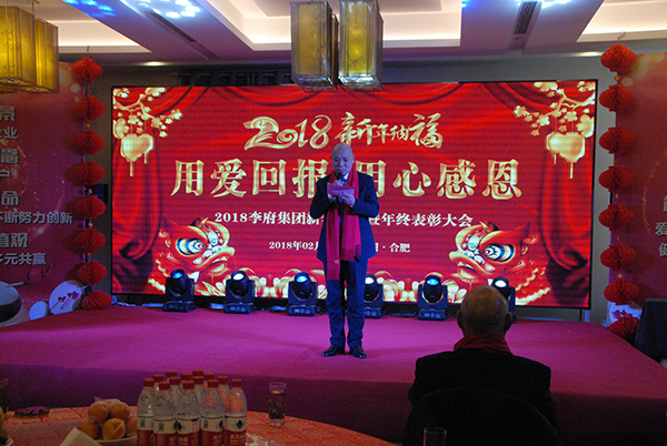 随着会场音乐响起,舞台灯光变得熠熠生辉,本次年会在集团总部家人欢快激扬的“大王叫我来巡山”舞蹈中正式拉开帷幕。集团董事长辛董登台发表年会致辞,他向到场的所有嘉宾、员工致以最崇高的祝福和感谢,并表示2017年李府集团在各位嘉宾的支持和所有李府人的拼搏下取得诸多荣誉,2018年我们将继续砥砺奋进、积极进取。