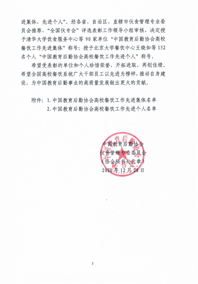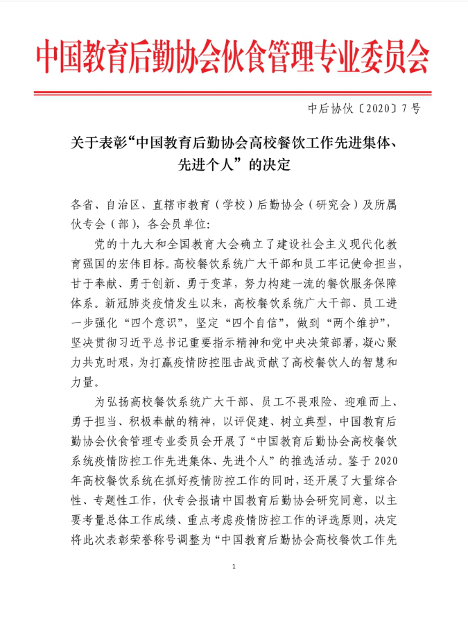 为弘扬全国高校餐饮系统广大集体、员工不畏艰险、迎难而上、勇于担当、积极奉献的精神,近日,中国教育后勤协会伙食管理专业委员会开展了“中国教育后勤协会高校餐饮工作先进集体、先进个人”的推选活动。我集团凭借防疫期间的突出贡献和优秀的品牌影响力,荣获“中国教育后勤协会高校餐饮工作先进集体”称号。