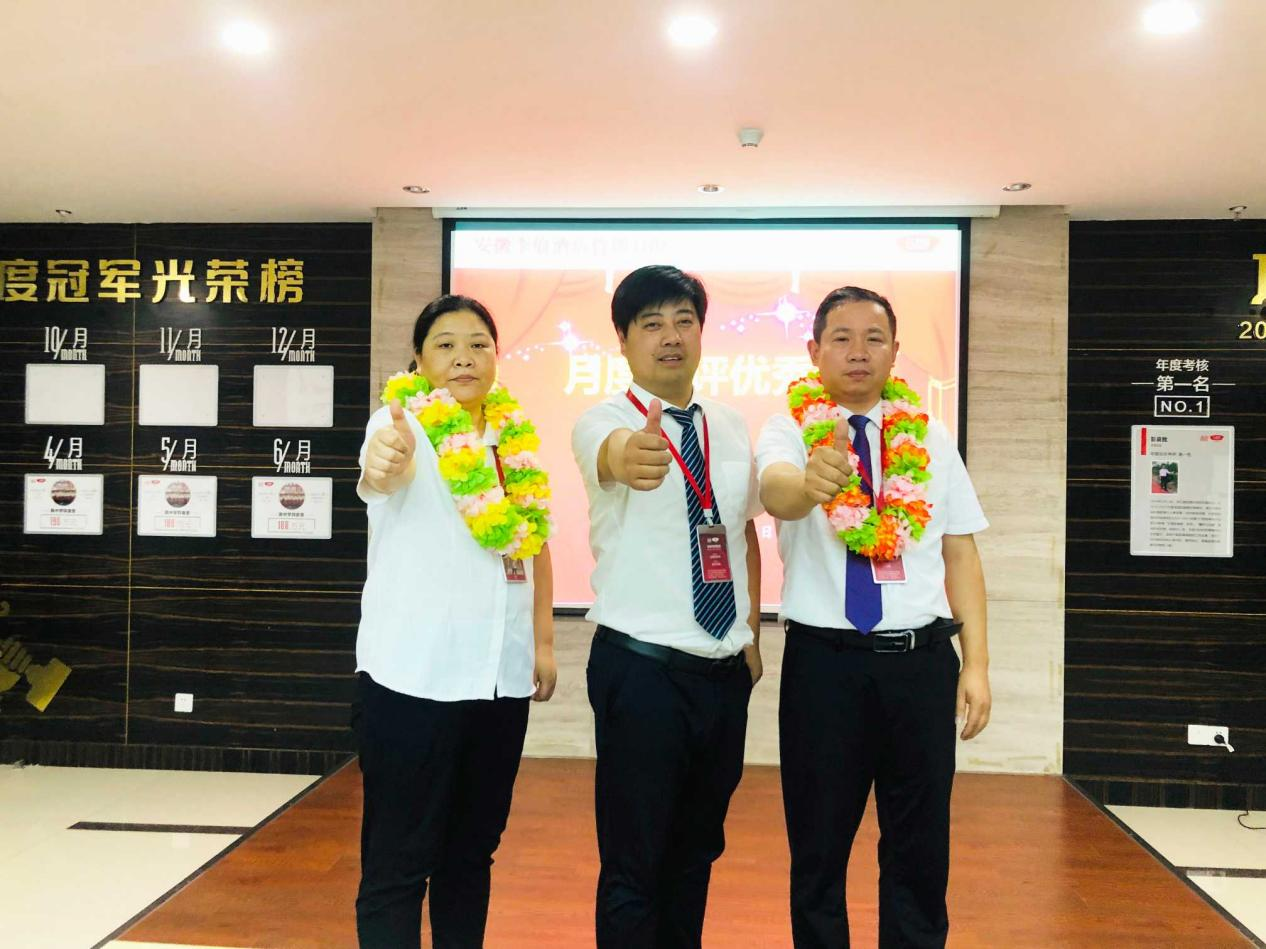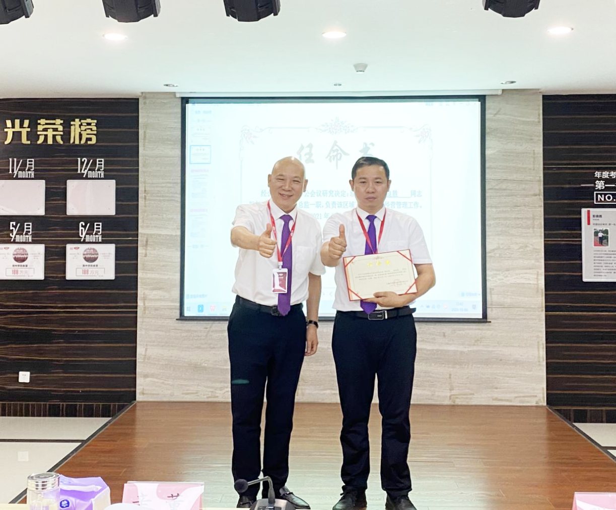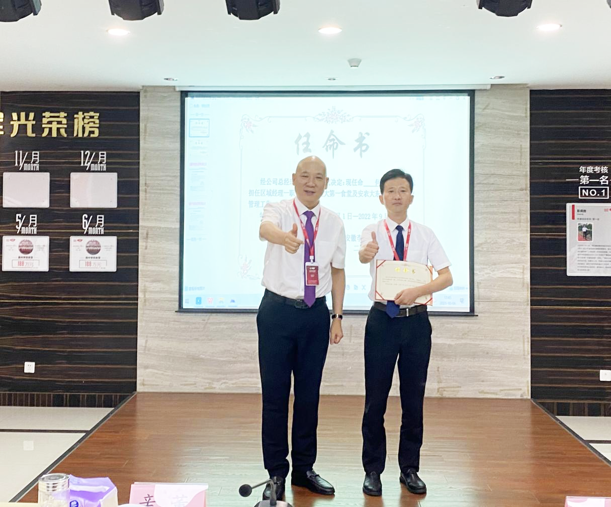 会议尾声,集团副总经理尹正会宣读任命文件,首先任命彭良胜担任滁州区域总监、何永凡担任区域经理,集团董事长辛董为两位管理人员颁发任命书,并与两位管理人员合影留念。本次会议在响亮的“我行一切都行,一切的不行都是因为我不行”口号中圆满结束。