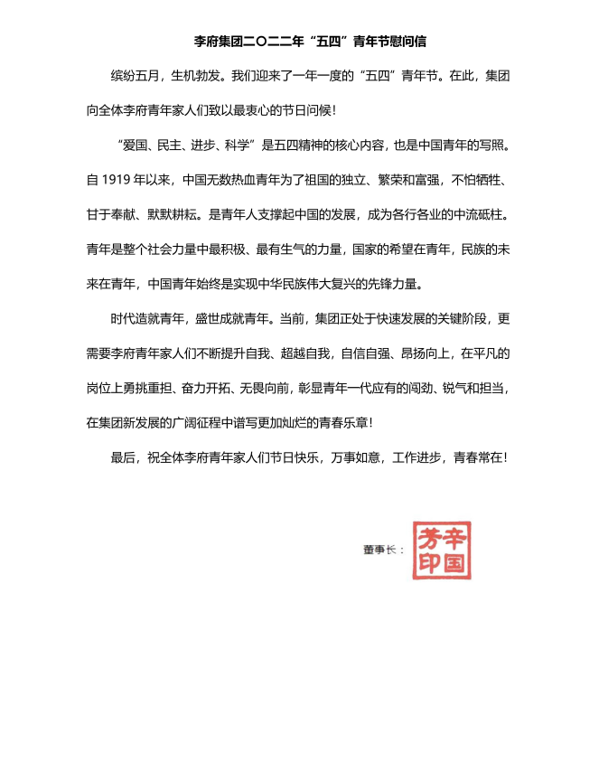 李府集团二〇二二年“五四”青年节慰问信