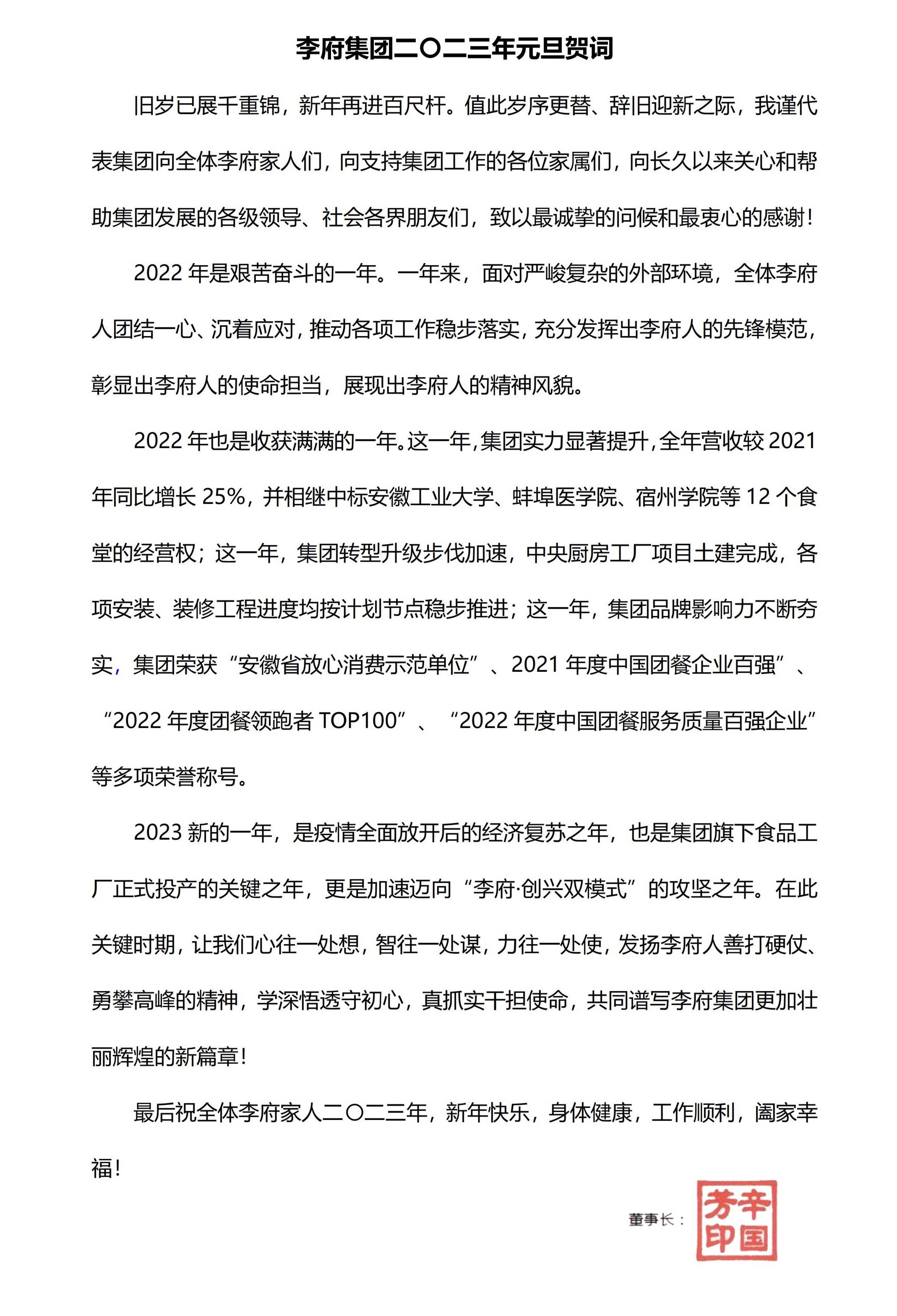 李府集团二〇二三年元旦贺词