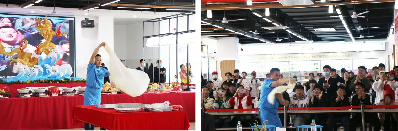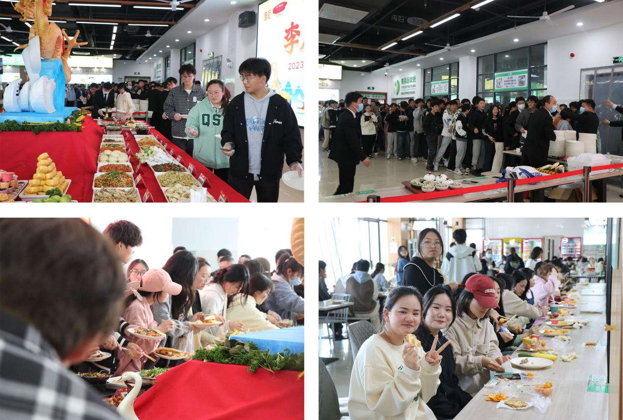 食堂活动现场人头攒动,热闹非凡。展台上摆放着巨大的中国龙造型,展现出雕刻师傅精湛的技艺;美食品鉴区人气火爆,食堂师傅们精心准备了金牌烤鸭、八宝葫芦鸭、香酥乳鸽皇、椒香口水鸡、清真白丝鱼、李府养生烩、香瓜飞燕虾、茶香炒鸭舌、巧手松鼠鱼等40余种的经典菜肴和20多种西式糕点、水果供同学们免费品尝,受到同学们的热烈欢迎。