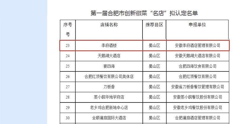 2023年5月8日,根据中共合肥市委办公室、合肥市人民政府办公室《关于印发〈合肥市就业促进行动方案〉等“暖民心行动方案”的通知》(合办〔2022〕8号)和《关于开展合肥市创新徽菜“名厨名菜名店”认定的通知》(合人社秘〔2022〕102号)等文件精神,经网络投票和专家评审后,我集团此次参赛的”李府砂锅牛肉“凭借良好的口碑,荣获第一届合肥市创新徽菜“名菜“,旗下“李府酒楼”荣获第一届合肥市创新徽菜“名店”。