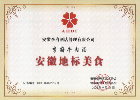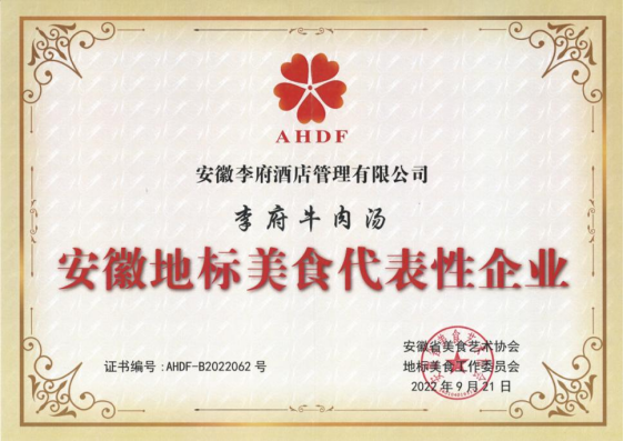 “完美好味道·百姓名小吃”已成为新时代安徽美食响应的品牌,吸引了大批旅游游客慕名而来,安徽美术艺术协会,积极发挥商会协会的职能,结合实际,宣传中国饭店协会地标美食标准,创新举办安徽地标美食文化节,从专业的角度,市场的维度,标准的高度,推动安徽地标美食提升。会上,发布了百家优秀餐饮品牌、百家地标美食名店。我集团凭借卓越的成绩和优秀的口碑,荣获“安徽地标美食代表性企业”,“李府牛肉汤”荣获“安徽地标美食”荣誉称号。