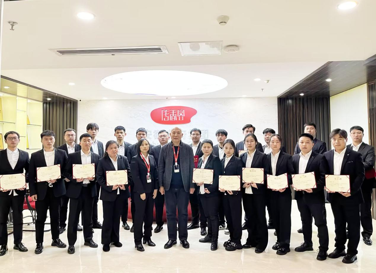 1月26日结业会议上,21名储备干部根据本次培训的学习情况,结合实际工作内容,分别登台作学习分享。随后,会议主持人公布了本次结业考试的最终成绩,21名参训人员均考核合格。辛董登台为参会人员进行了知识分享,大家听完辛董的讲解后都受益匪浅,全场掌声雷动,备受鼓舞。最后,集团董事长辛董亲自为所有参训人员颁发结业证书并合影留念。