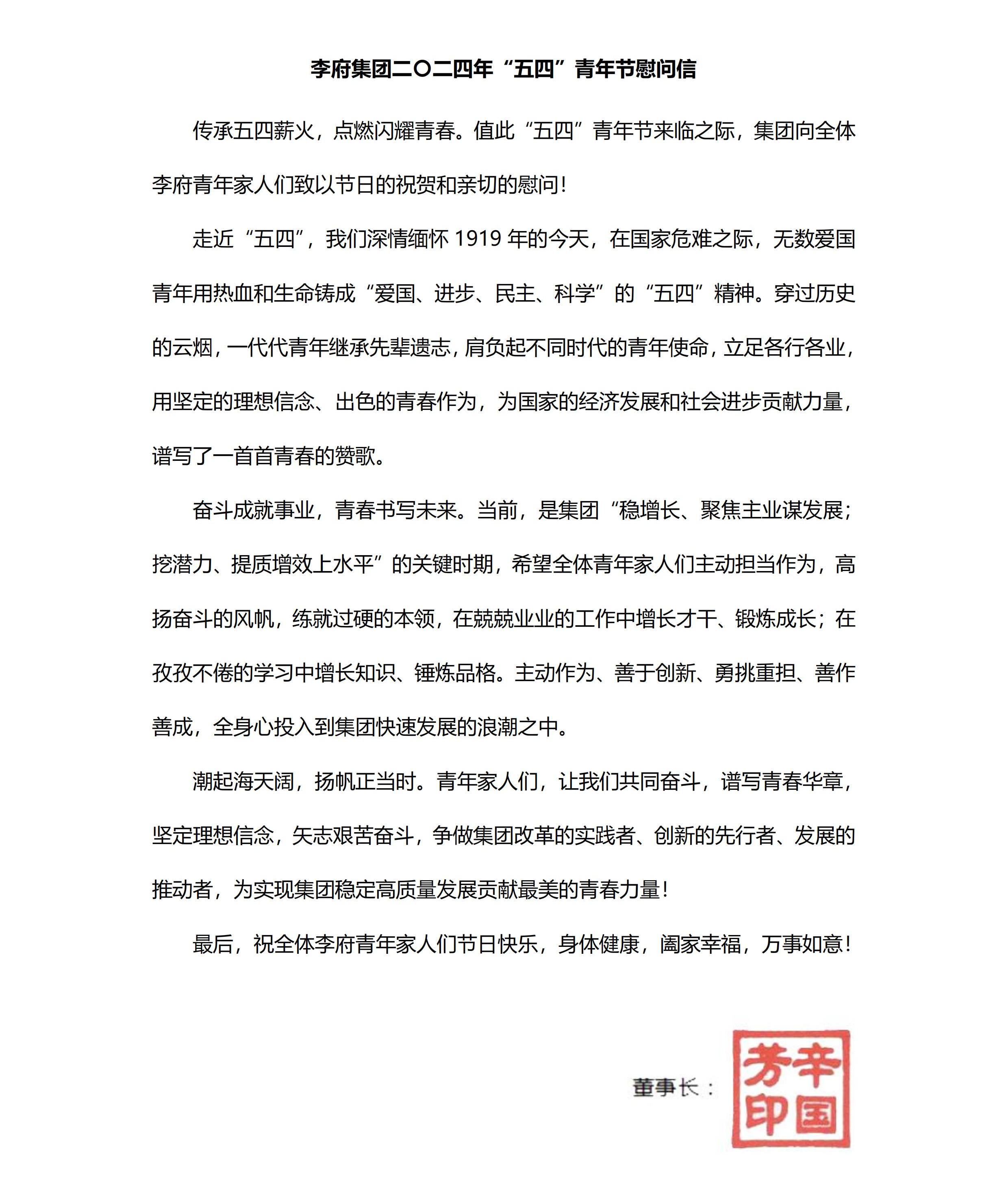 李府集团二〇二四年“五四”青年节慰问信