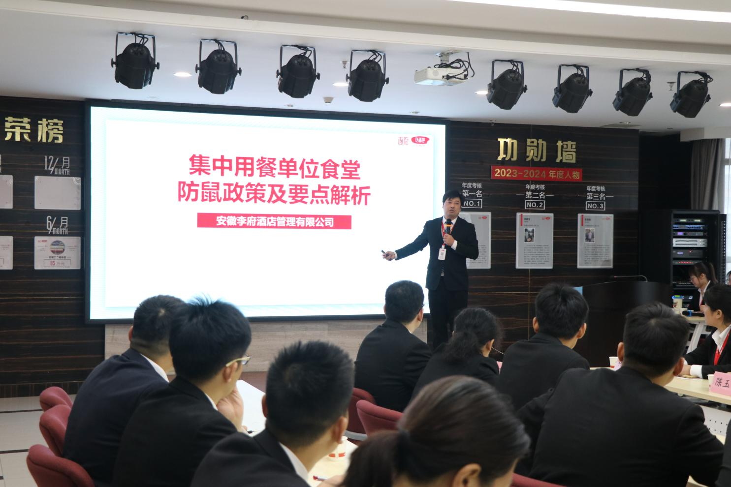 会议在主持人开场致辞及全体人员合唱会歌《团结就是力量》中拉开帷幕。会上,集团各部门负责人就本部门10月份的工作重点进行了详细布置。财务部经理张跃就集团下辖各传香客食堂的财务数据及经营完成情况进行了数据分析。副总经理尹正会通报了9月份各传香客食堂经理的考核结果及食堂各岗位产值完成情况,并对月度考核优秀的梁浩经理、彭良胜总监、沈洁洁经理进行了表彰,三位优秀管理人员共同登台,就各自工作的亮点和经验进行了分享。副总经理崔君秋宣读了集团下发的红头文件,并将总经办的工作要求向参会人员进行了布置。副总经理张超公布了9月份传香客食堂“五星排行榜”和经营分析表,并紧接着进行了《集中用餐单位食堂防鼠政策及要点》及《营销理论与食堂营销策划模式》等业务培训。随后,李府央厨生产管理部总监唐钢带来了《李府央厨产品介绍》的专题培训,详细阐述了李府央厨产品特色及优势。培训后,各食堂经理围绕央厨产品展开了交流,不仅加深了对央厨产品线的理解,也在互动中相互学习,共同推动了经验的有效落地。