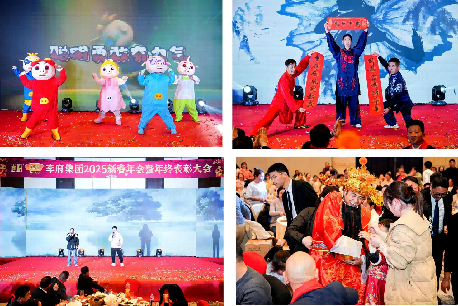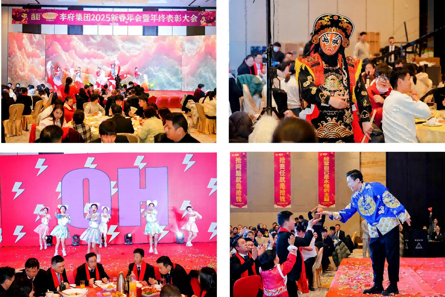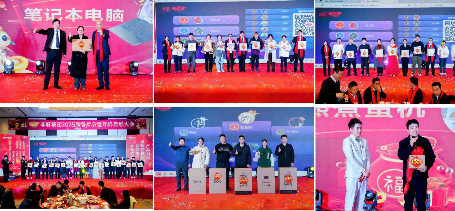 随着夜幕的降临,晚宴环节正式开始后,在热闹欢快的氛围中,集团领导、嘉宾与李府家人、家属们共同举杯,欢聚一堂,共度这个难忘的夜晚。晚宴通过精彩的节目,开心的游戏,还有层出不穷的抽奖环节,将现场的氛围推向一个又一个高潮。台上喜庆祥和,台下欢声笑语,昔日的汗水都化为杯中的美酒,大家举杯共饮,共同祝愿2025年的李府更加美好。